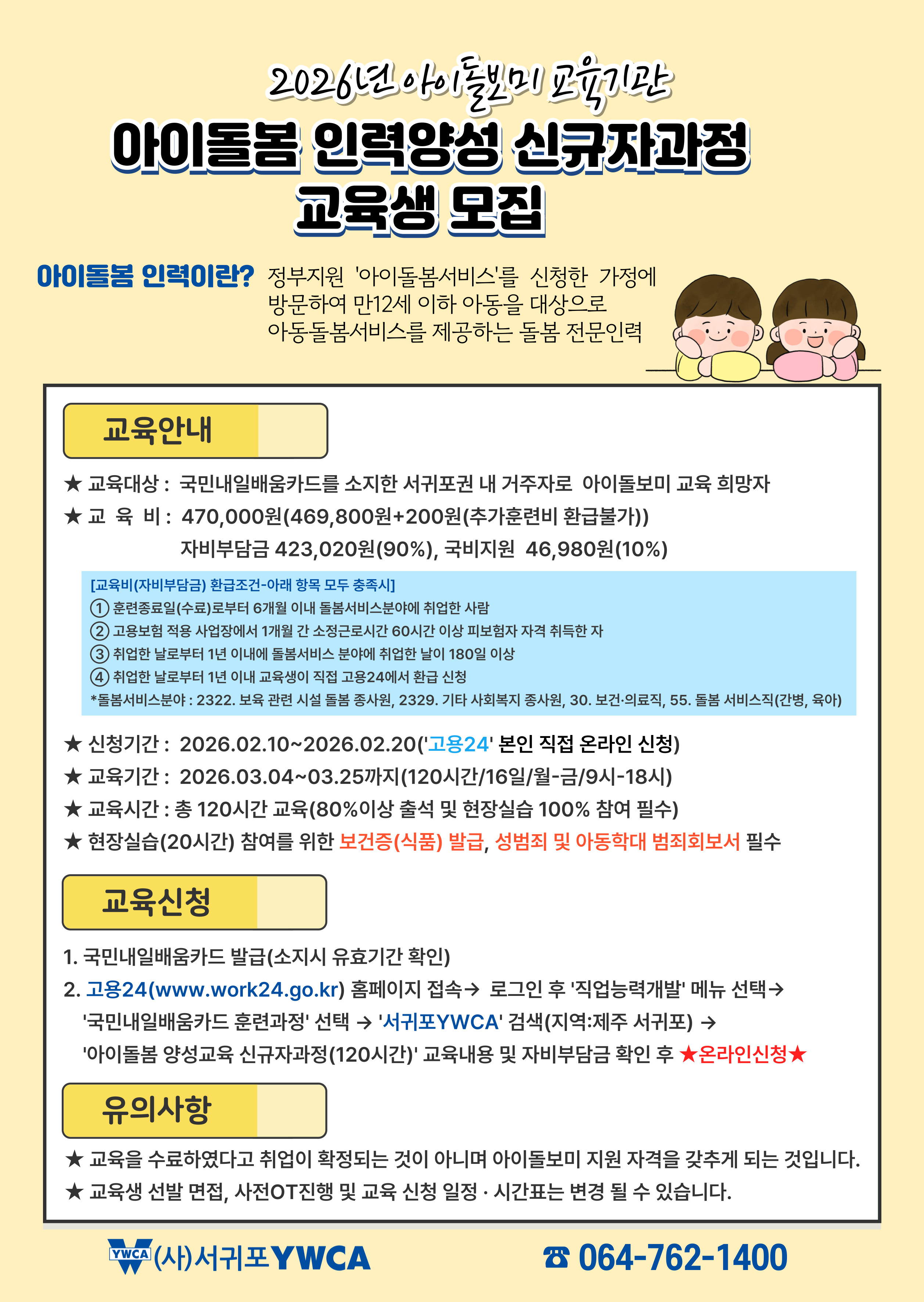 (사)서귀포YWCA는 국민내일배움카드로 운영되는 2026년 아이돌봄 인력양성 신규자과정 교육생을 모집합니다.