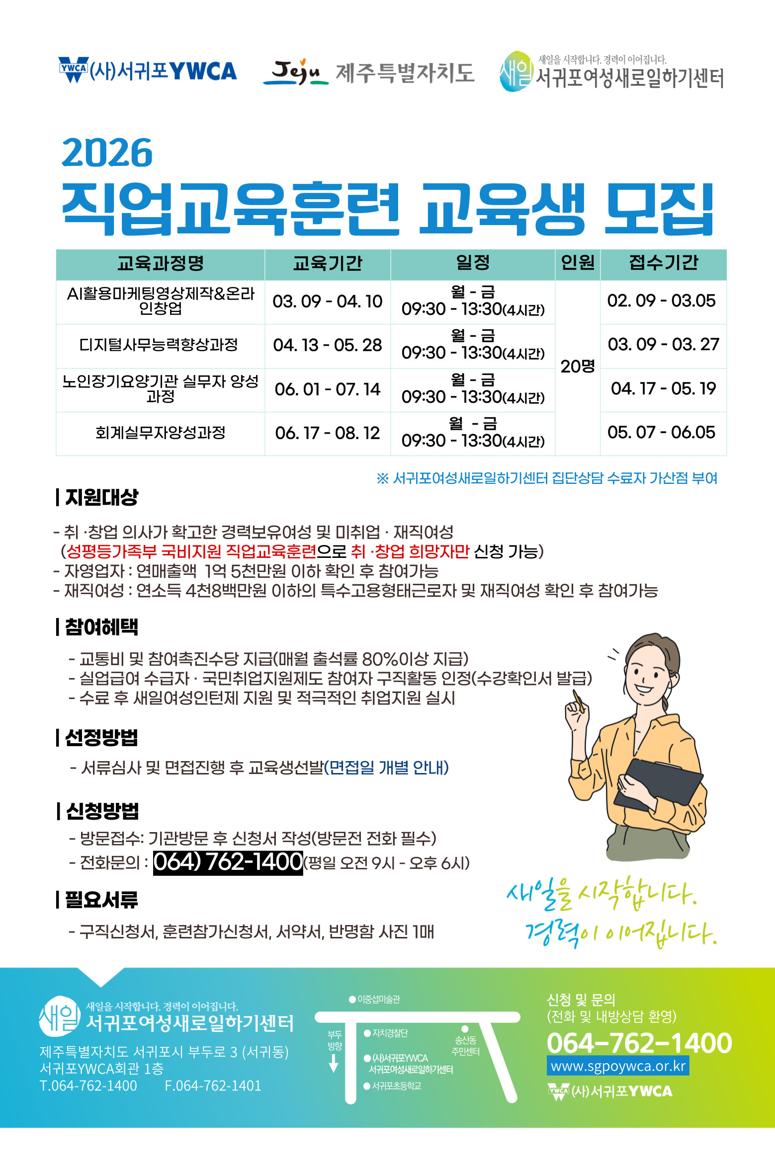 교육대상은 취·창업 의사가 확고한 경력보유여성 및 미취업, 재직여성이며 각 과정당 20명을 모집하고 서류 및 면접심사를 거쳐 교육훈련생으로 선발한다. 교육장소는 서귀포YWCA회관이며 훈련혜택으로는 출석률 80%이상인 교육생에게 교통비 월5만원씩 지급하며, 수료 후에는 직장적응을 위한 새일여성인턴제 지원과 적극적인 취업지원이 이루어진다.