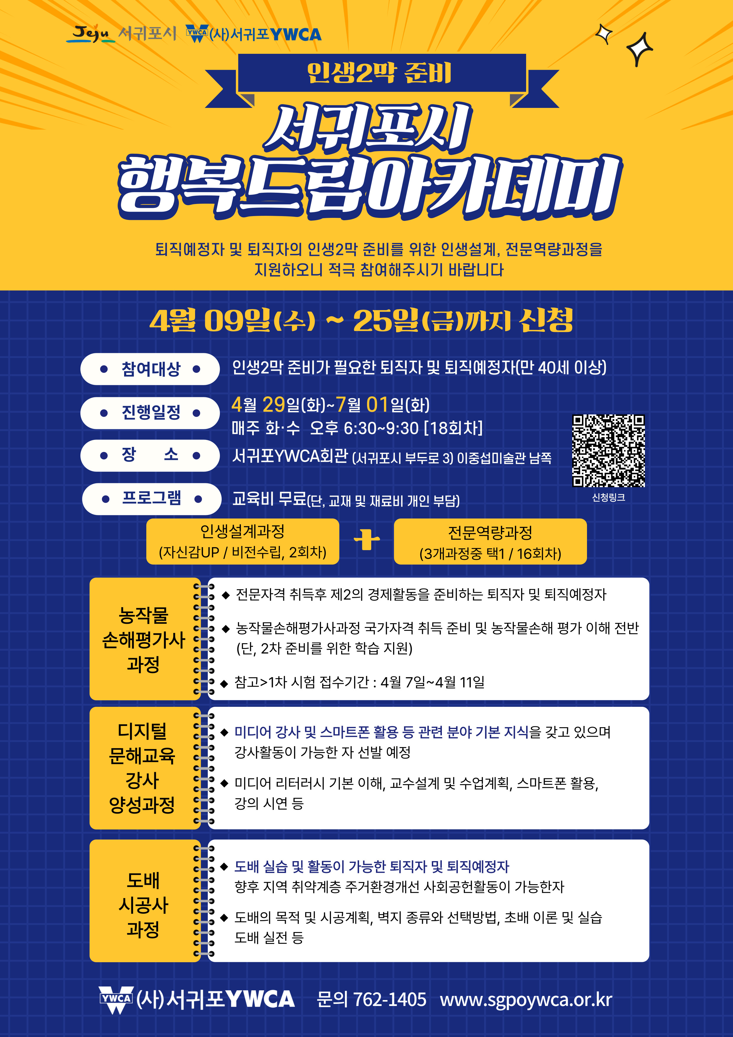 (사)서귀포YWCA(회장 김정미)는 ‘2025 서귀포시행복드림아카데미’에 참여할 퇴직자 및 퇴직예정자 50명을 4월 9일부터 25일까지 과정별로 모집한다.